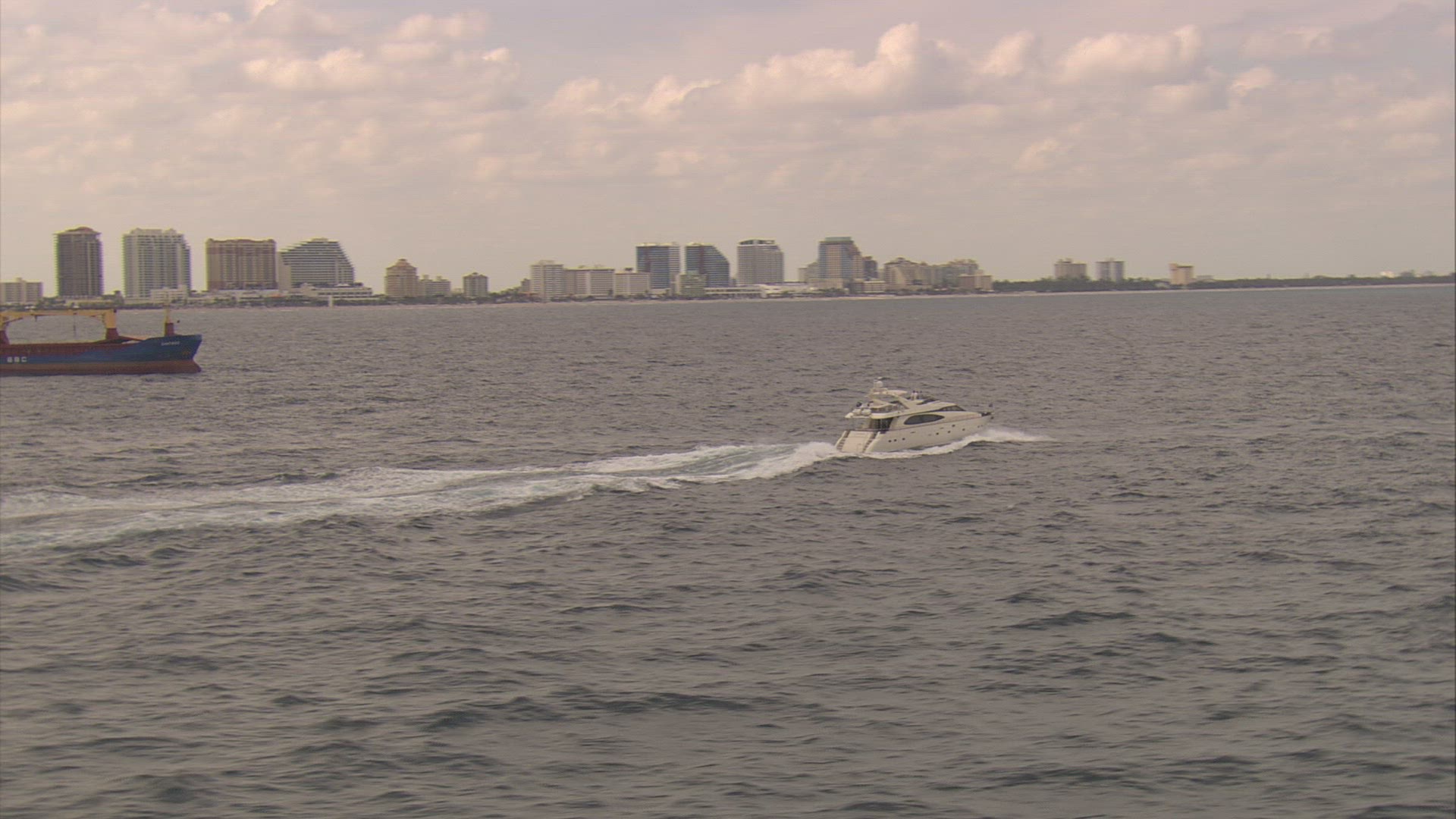 Aerial shot of white yacht sailing in blue ocean. Beautiful waterscape and skyline