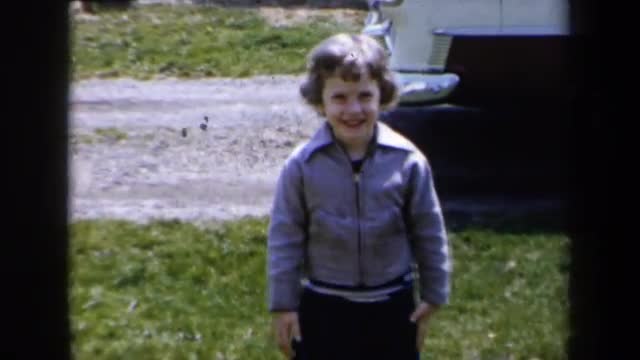 > 1959: a young short haired girl is running towards the camera in her yard NEW YORK