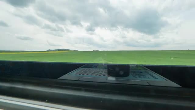 Time lapse shot inside of modern empty train wagon with table, seat places and windows, that seen countryside, Vienna, Austria