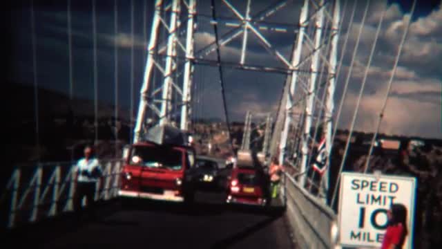 > 1938: a lady looking down while crossing a narrow bridge in the countryside NEW YORK
