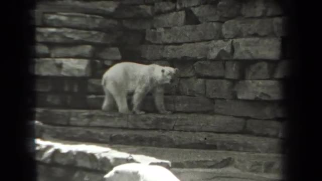 > 1939: one polar bear climbs steps of stone enclosure while other rests on haunches by pool NEW YORK