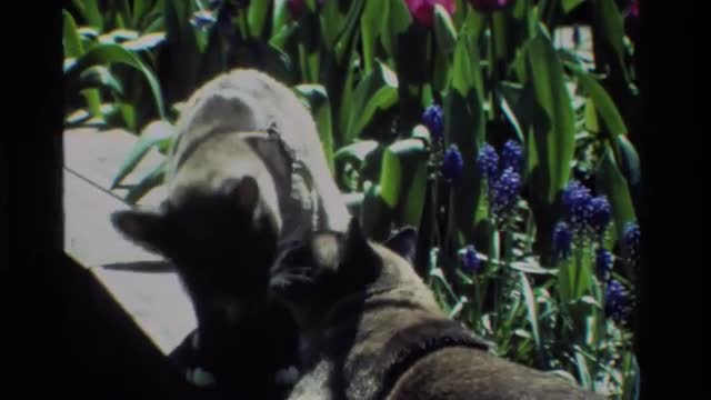 > 1984: two cats are playing with each other with large grass on one side CALIFORNIA