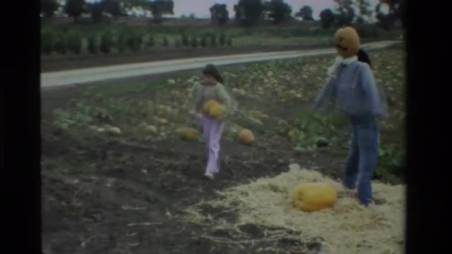 > 1984: a mother and her young daughter carry pumpkins and examine their scarecrow CALIFORNIA