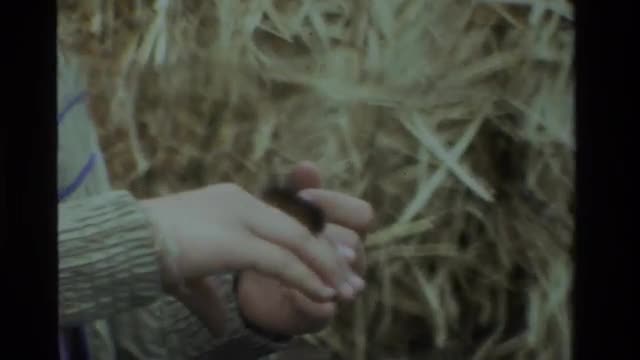 1984: older woman and girl watch fuzzy and dark caterpillar walk on their hands outdoors CALIFORNIA