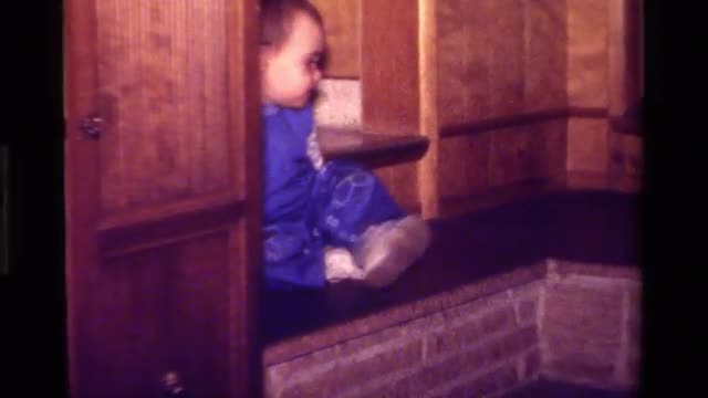 > 1979: child wearing denim overall that it crawling. CALIFORNIA