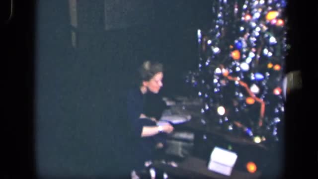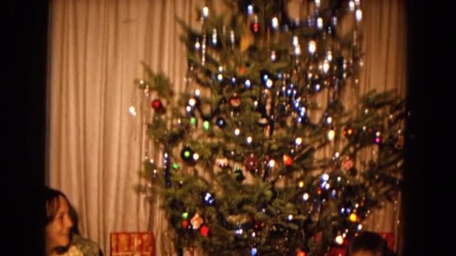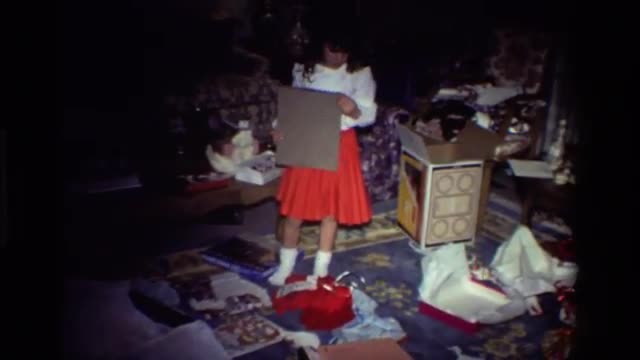 > 1981: two people opening presents at christmas in a living room strewn with boxes and wrapping CALIF