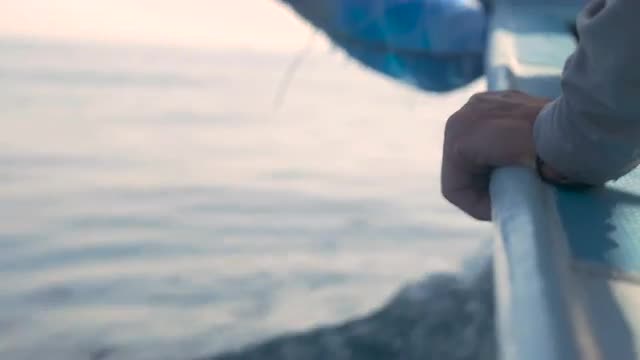 Close-up shot of a child pulling hand to water from the sailing boat. He wants to feel splashes on high speed