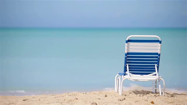 Tilt shot of clear blue lagoon skyline and empty chaise-longue on white sand beach. Place in the sun on tropical island waiting for the tourist on vacation