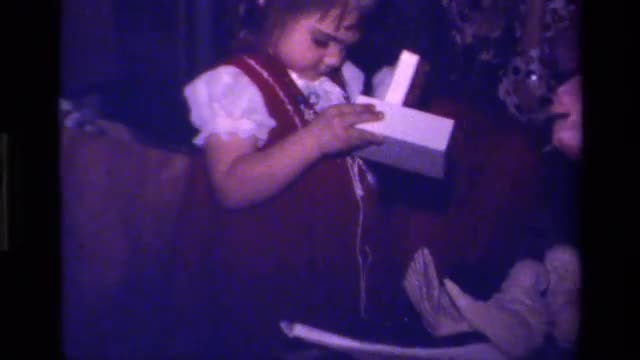 > 1979: child opening christmas present with other toys and christmas tree in background CALIFORNIA