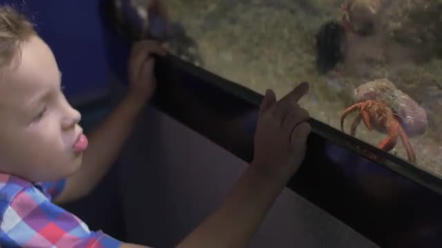 > View of small blond boy standing near aquarium with crabs, Valencia, Spain