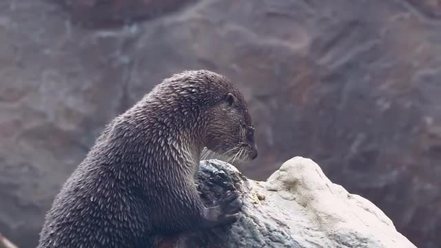 View of small blond boy standing near aquarium with crabs, fishes and rock, Valencia, Spain