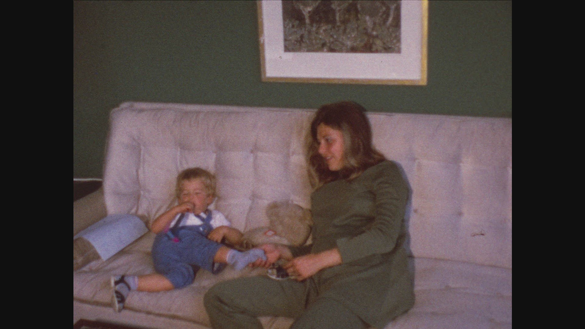 View of mother lying on the bed with small son against huge panoramic window and cityscape with traffic road, Barcelona, Spain