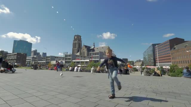 Child and mother having fun during evening city walk. Mother spinning around and playful kid with backpack repeating her
