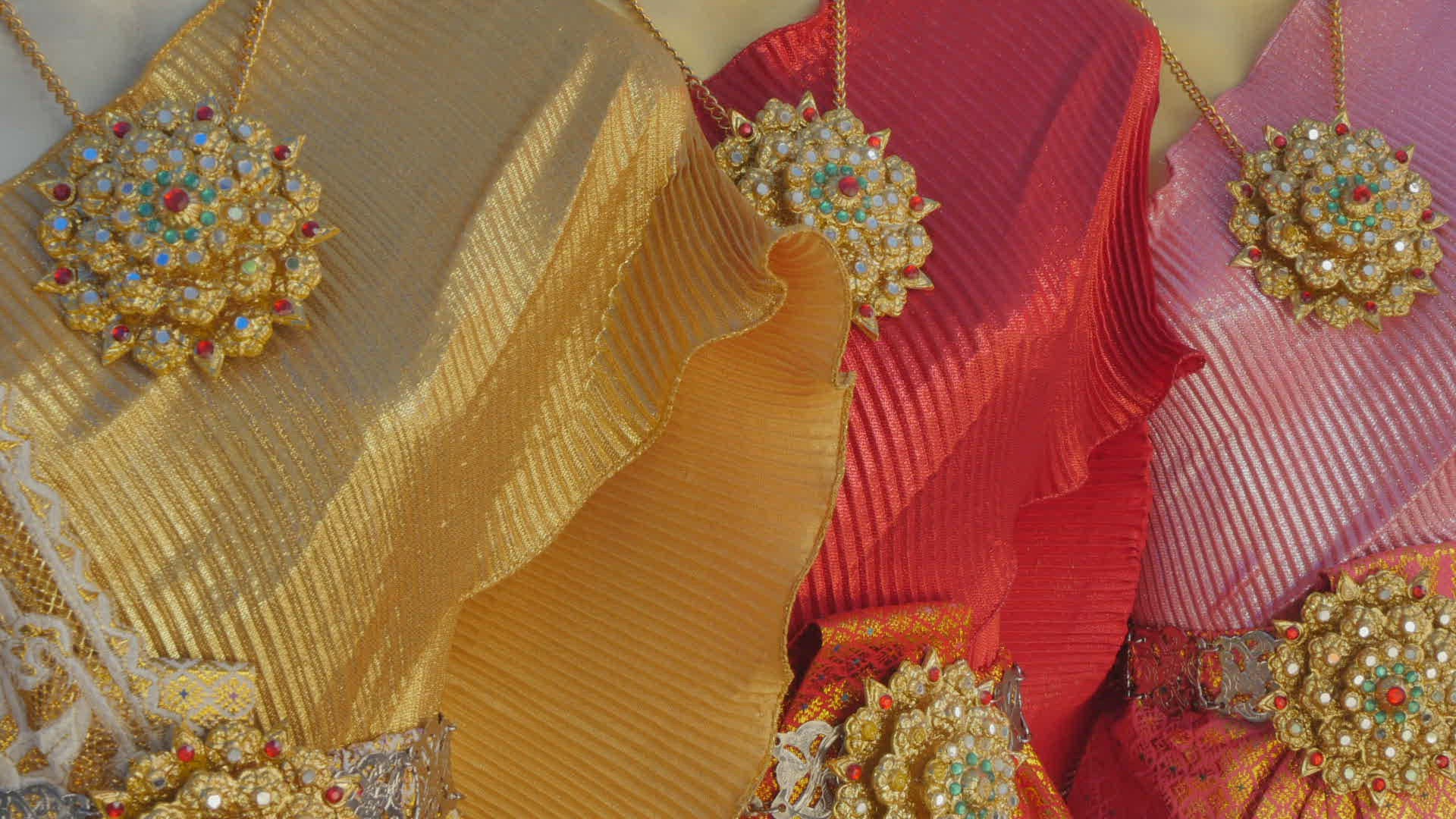 > 1984: women in silk dresses at a temple in southeast asia THAILAND