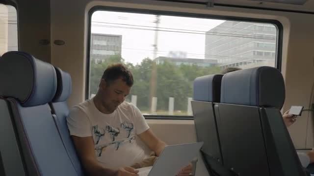 Young man traveling by commuter train and communicating online using laptop