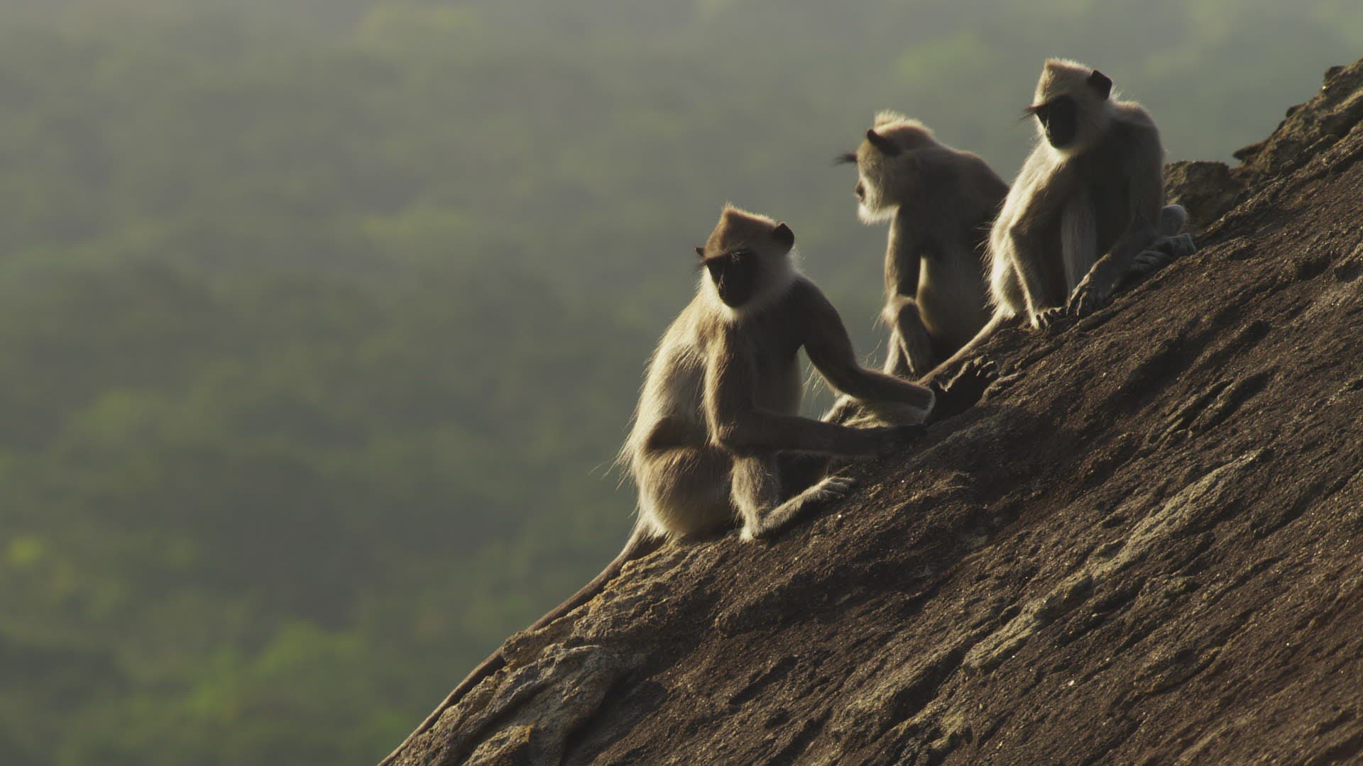 > 1984: three monkeys and two babies sitting on a rock wall SINGAPORE