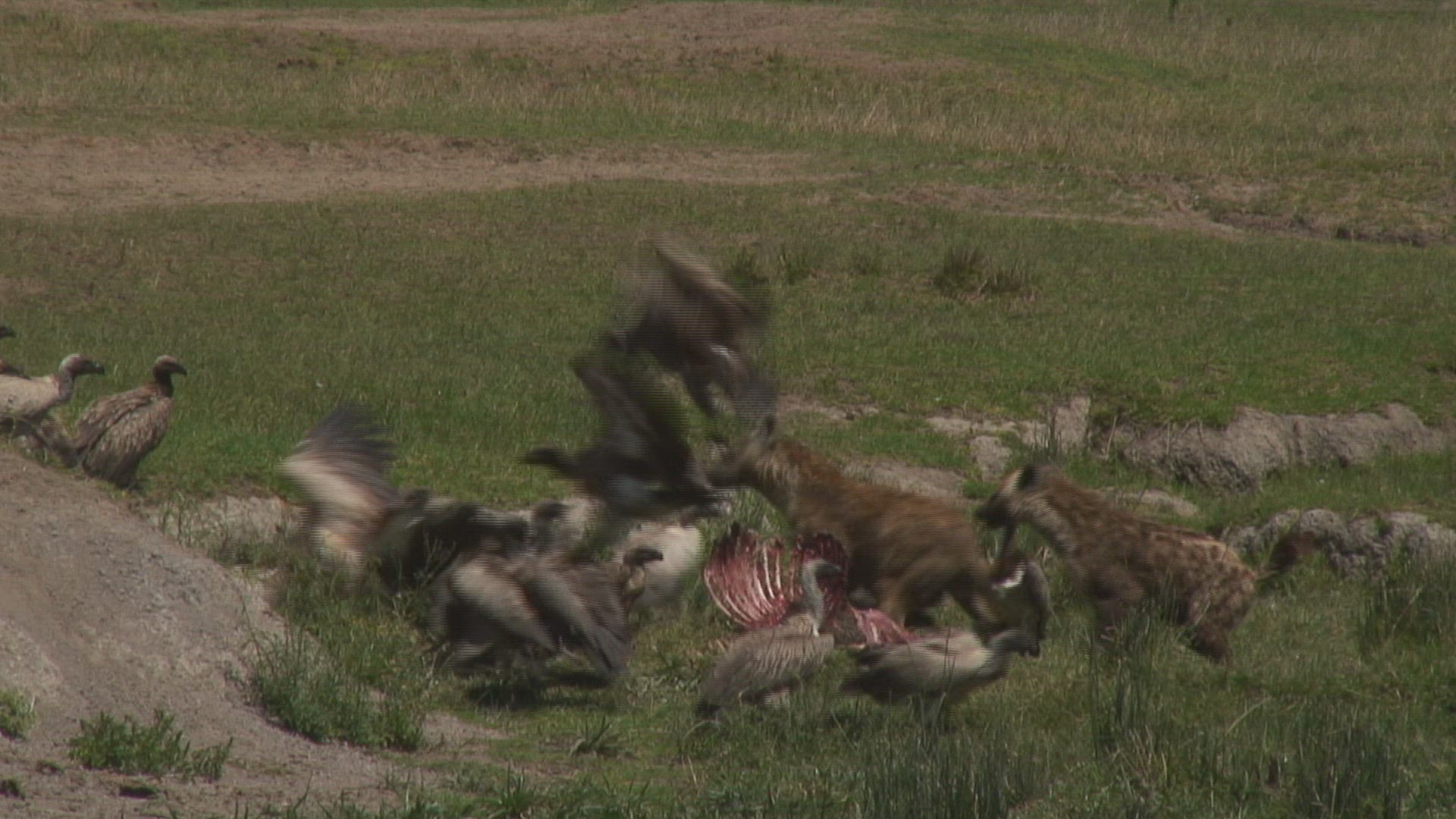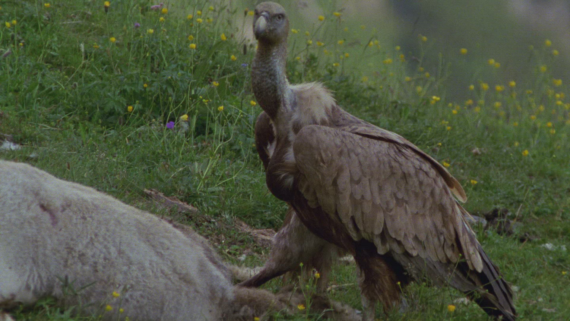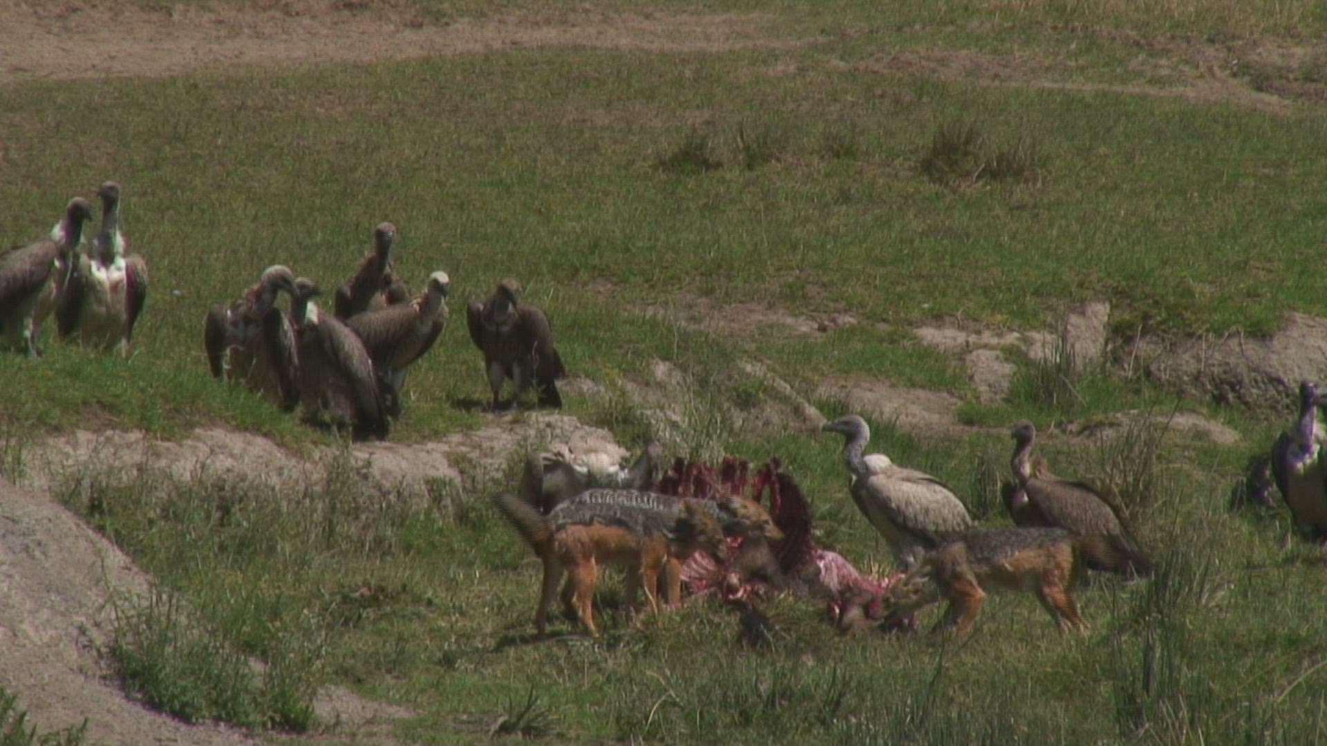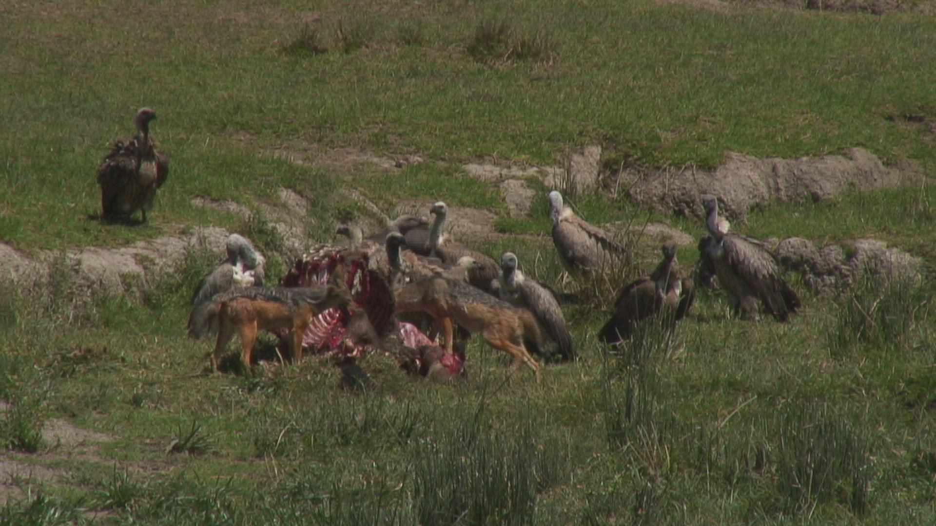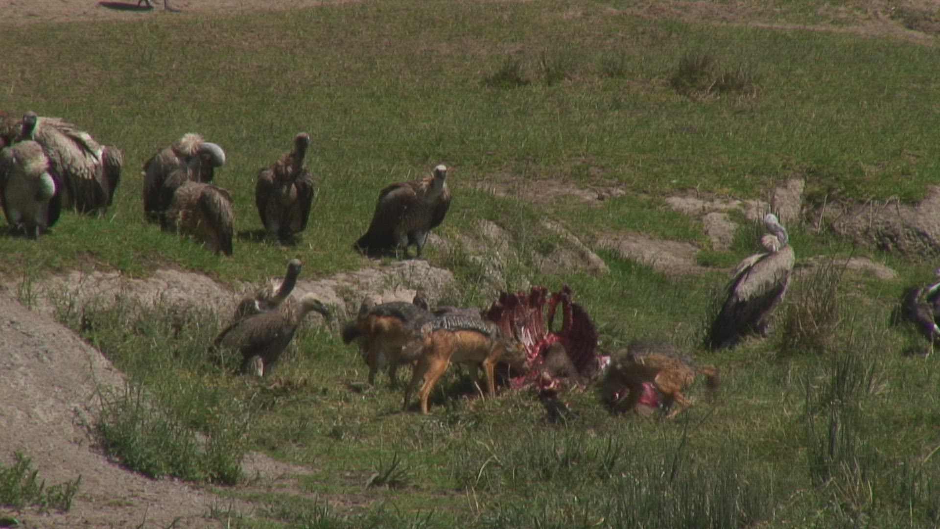 > 1983: vultures and a jackal scavenge on the carcass of some african plains animal MARA TANZANIA