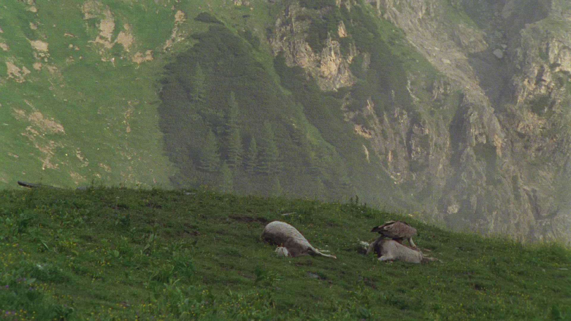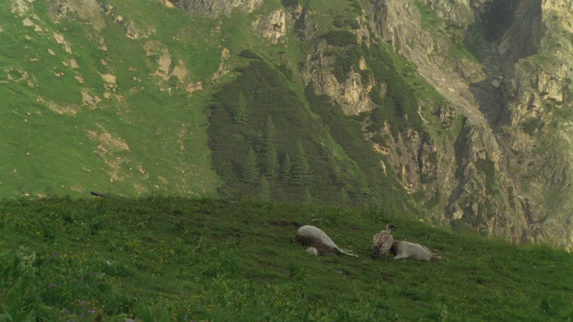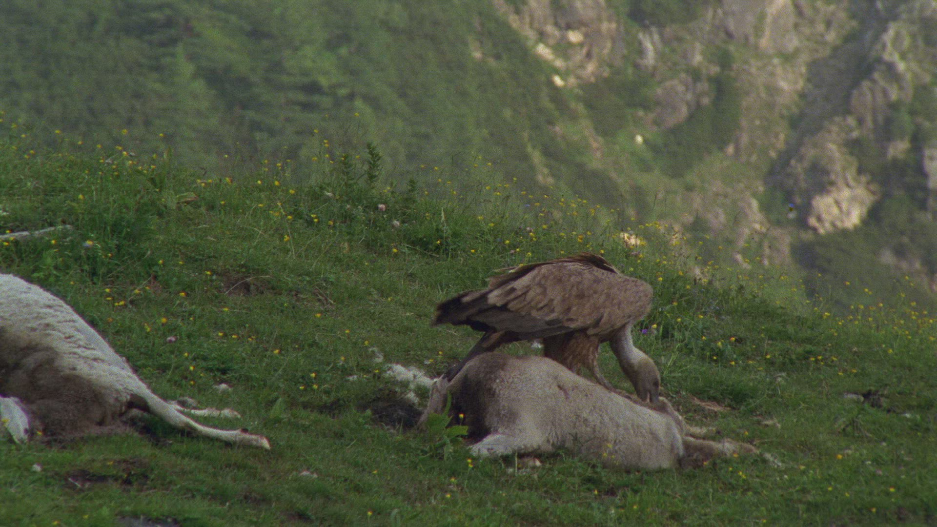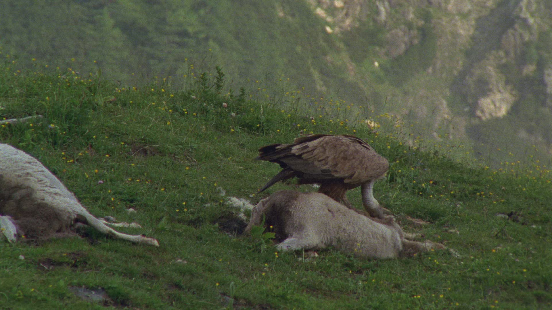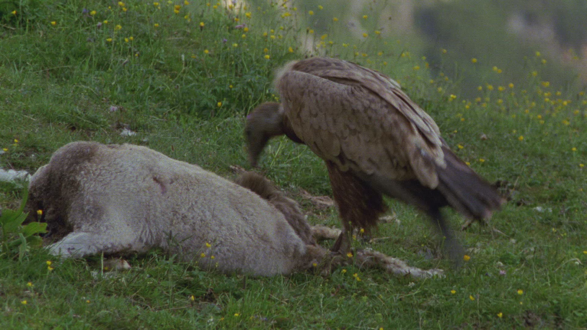 > 1983: vultures and a jackal scavenge on the carcass of some african plains animal MARA TANZANIA