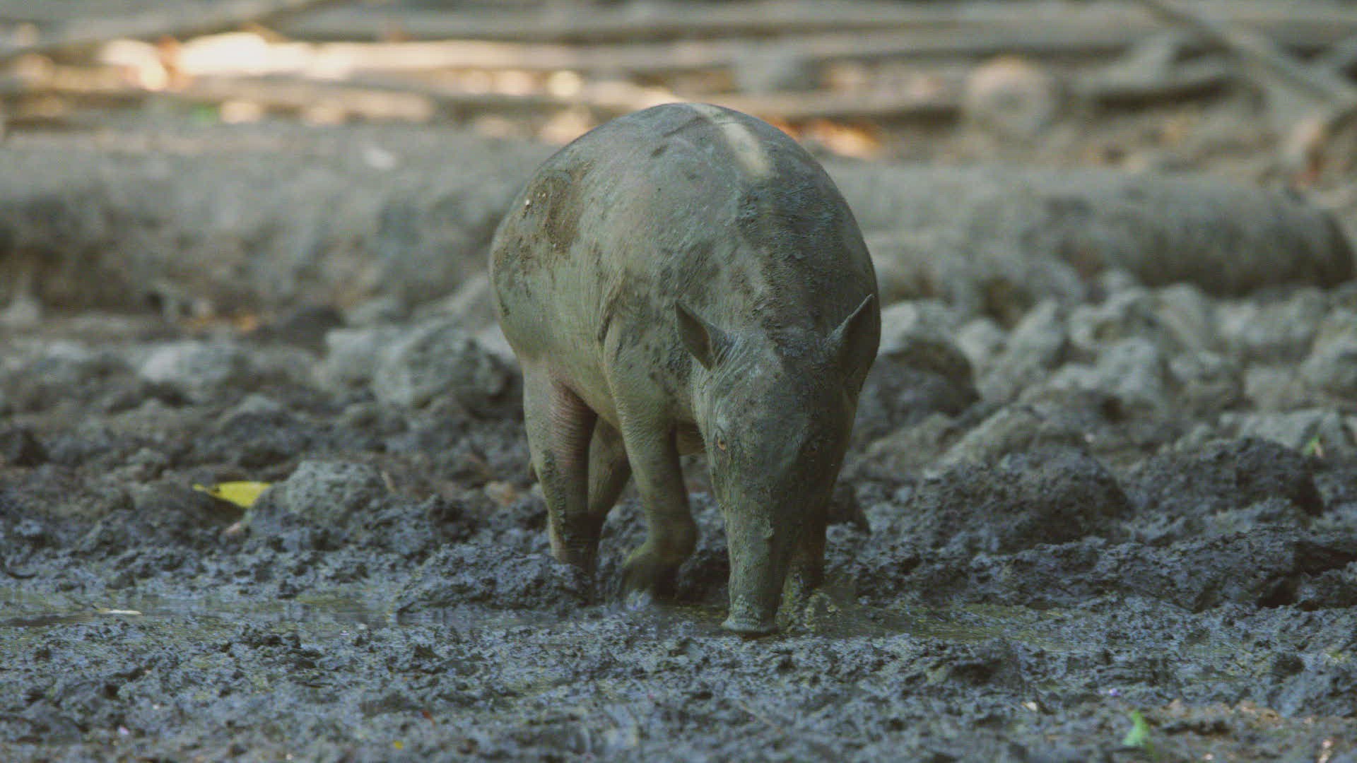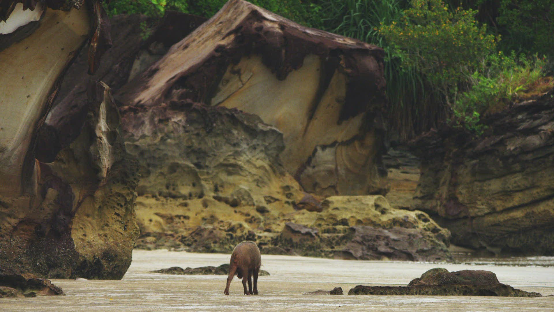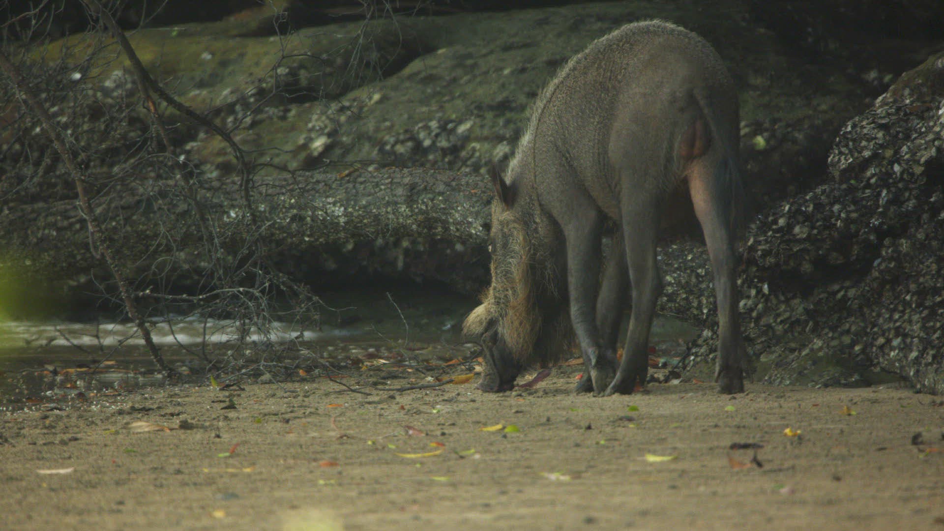 > 1983: a wild pig scratching his back and walking around a rock in a desert KENYA