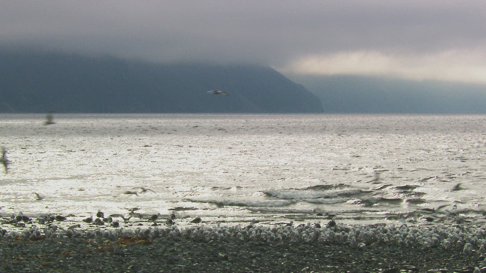 > 1983: water birds fly and swim in a large lake with hills faint in the background. MARA TANZANIA