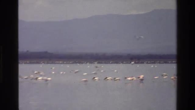 1983: water birds fly and swim in a large lake with hills faint in the background. MARA TANZANIA