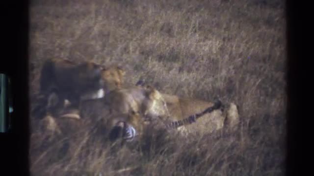 > 1983: a group of hungry lions busy feasting on a zebra in a wildlife park MARA TANZANIA