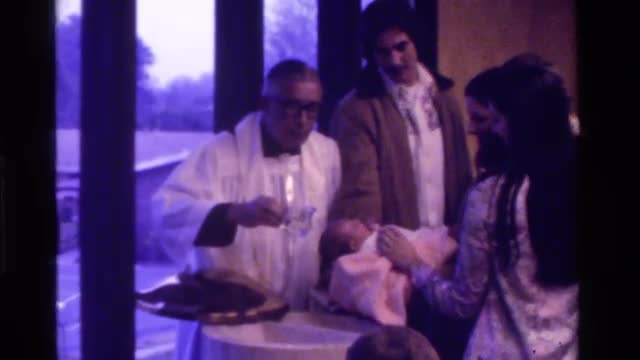 > 1975: a mother holding her baby next to a priest CALIFORNIA