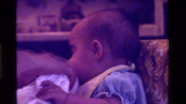 > 1975: someone cleaning the face of a small baby with towel CALIFORNIA