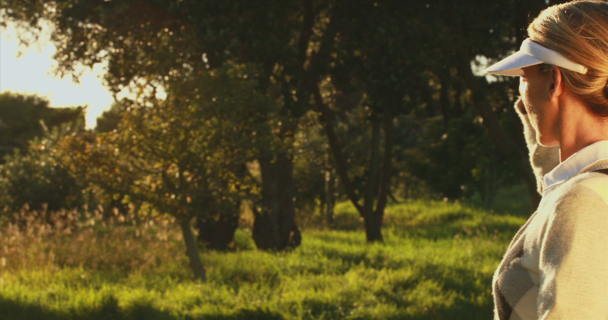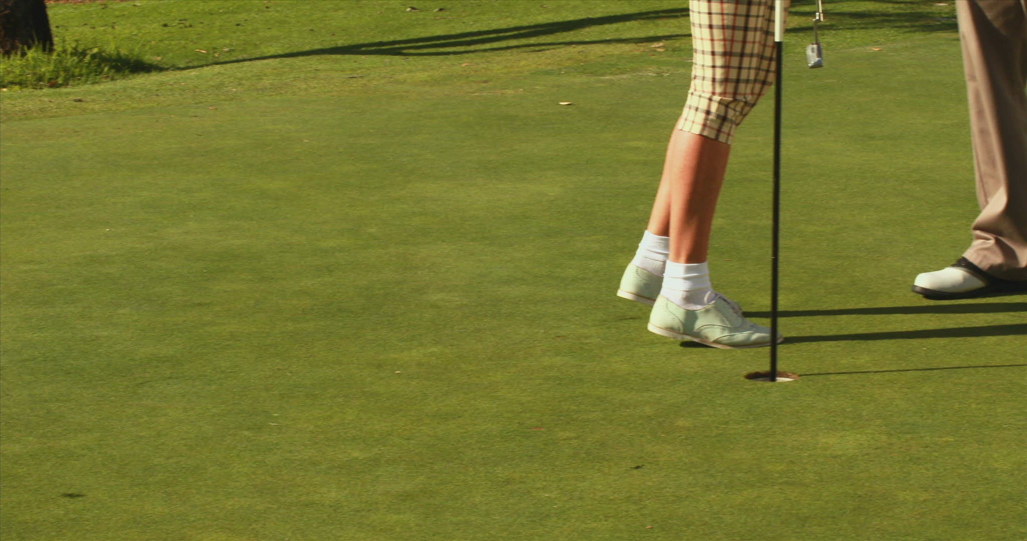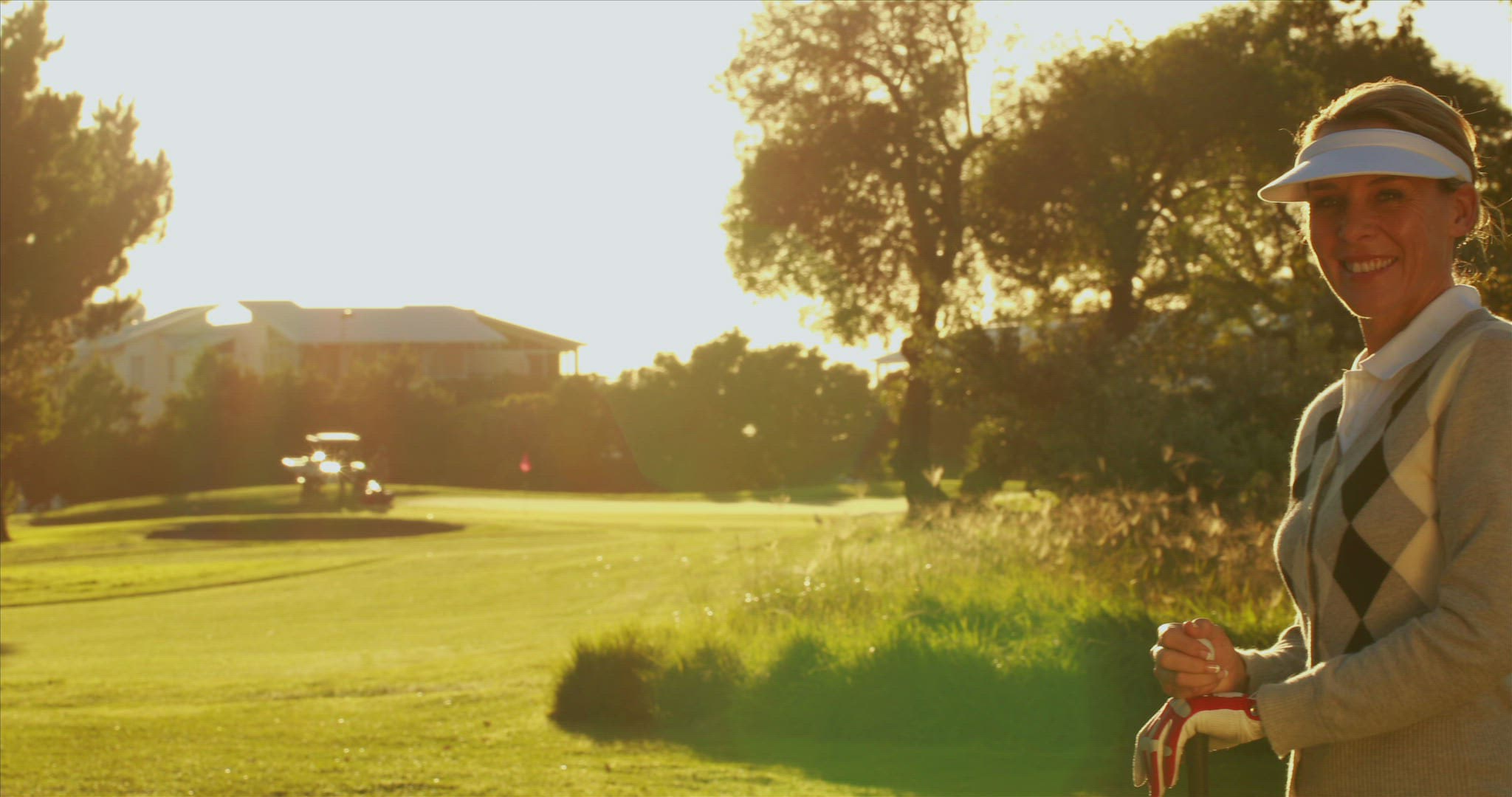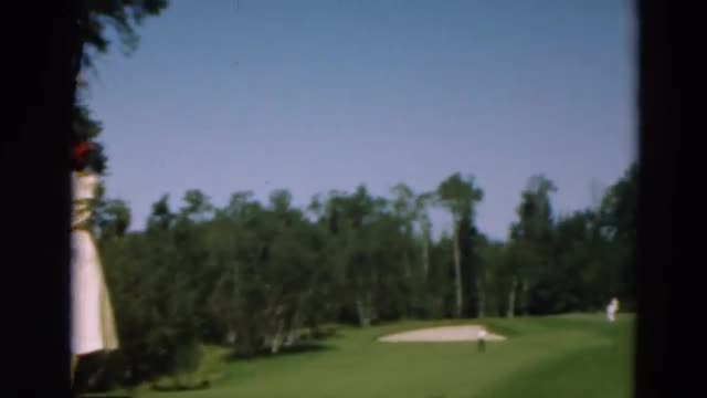 > 1976: woman swinging at a golf ball while on a city course with a man waiting in a golf cart LAGUNA