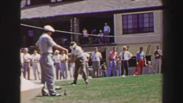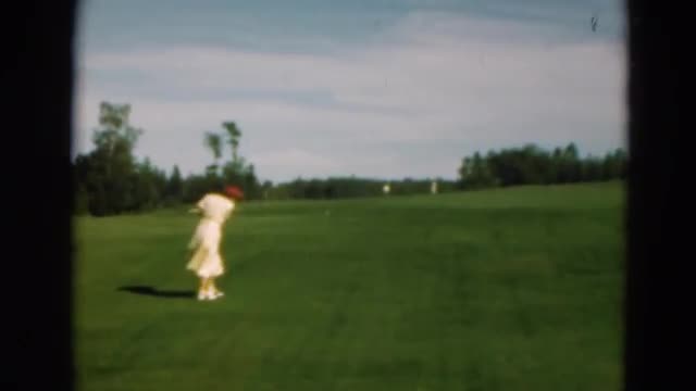 1976: woman swinging at a golf ball while on a city course with a man waiting in a golf cart LAGUNA
