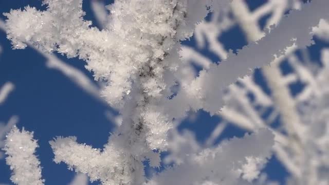 Hoarfrost on Branches of a Christmas Pattern Macro Camera Motion Background Blue Sky Sunny Winter Day