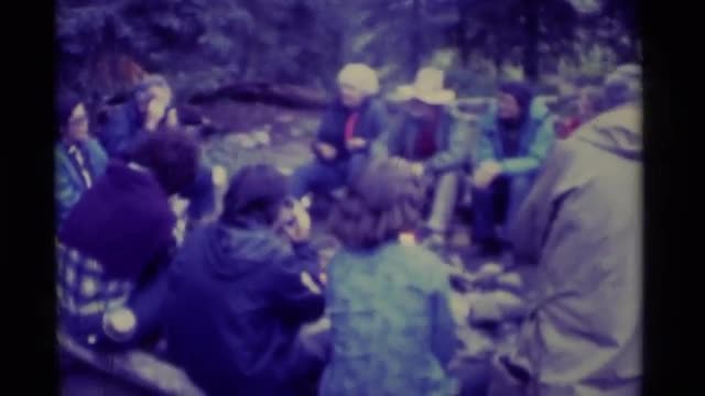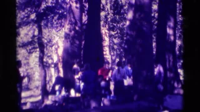 > 1975: a group of people gather together in the woods MINARET WILDERNESS CALIFORNIA