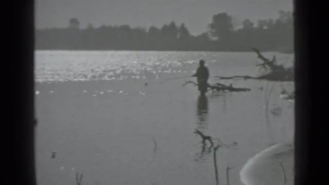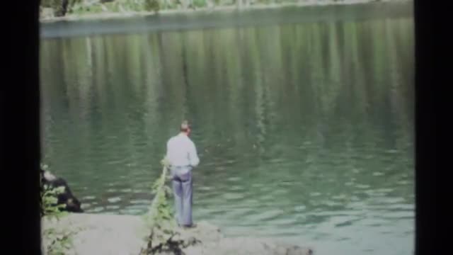 > 1972: a man fishing in a river next to a large forest HOLLAND LAKE MONTANA