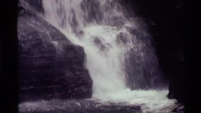 > 1973: a waterfall cascades down a into a waiting river beneath it SCAPEGOAT WILDERNESS MONTANA