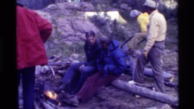1972: men camping, sitting by fire on log, standing, and sawing wood HOLLAND LAKE MONTANA