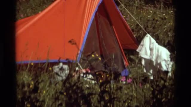 > 1977: man camping steps out of tent to get dressed. SAPPHIRE LAKE MONTANA
