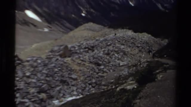 > 1979: piles of slag in a valley of tall rocks peaks and snow BRITISH COLUMBIA CANADA