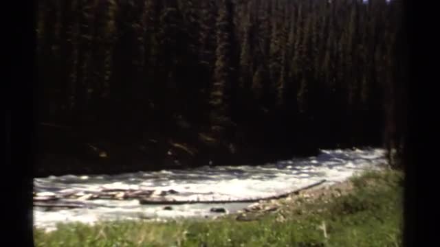 > 1979: river with forested bank on one side, and meadow on the other BRITISH COLUMBIA CANADA