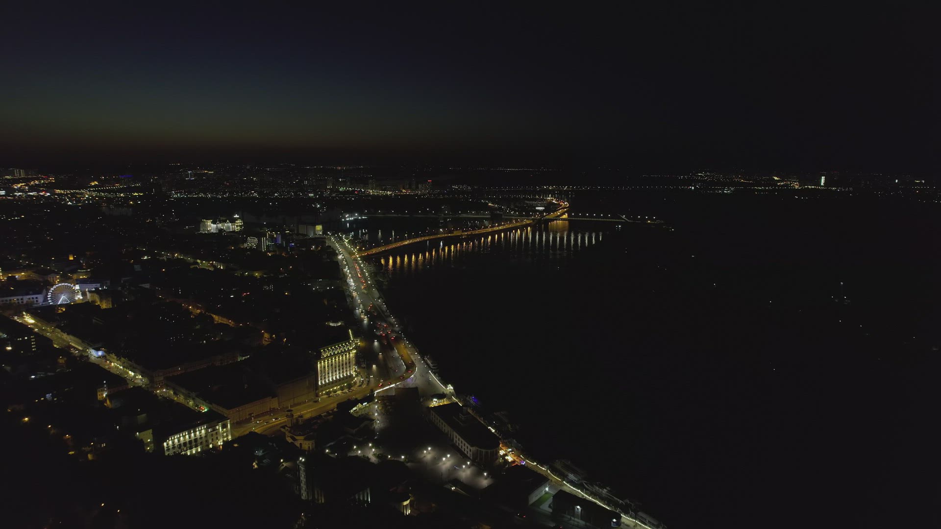 View from moving on the river boat of the buildings with lighting windows on the waterfront, Amsterdam, Netherlands