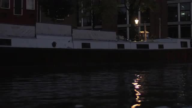 > View from moving on the river boat of the buildings with lighting windows, Amsterdam, Netherlands