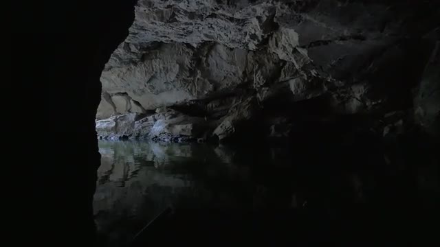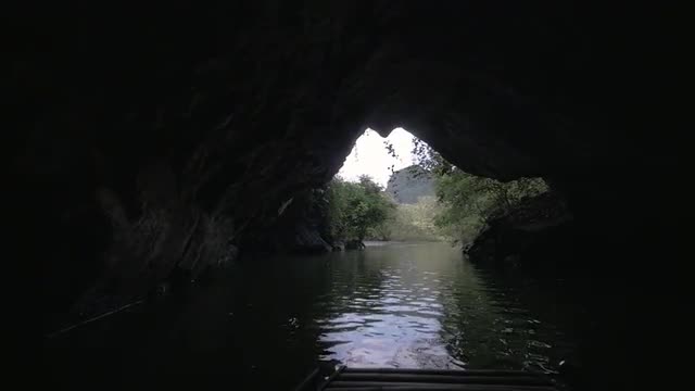 Slow motion shot of sailing from dark karst cave with following scenery of limestone mountains. Traveling in Trang An, Vietnam