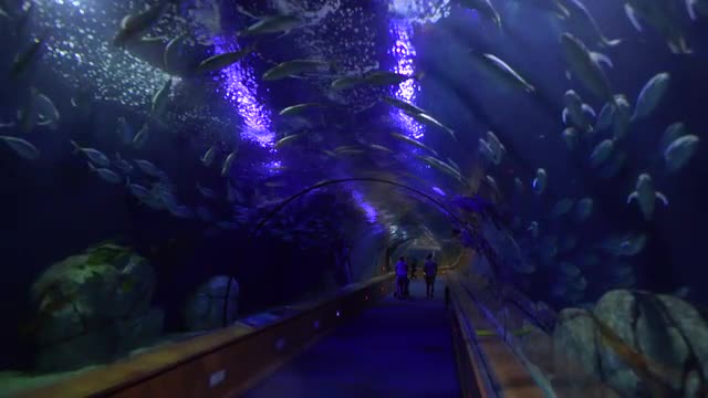 > Woman with pad making photos in underwater tunnel of oceanarium