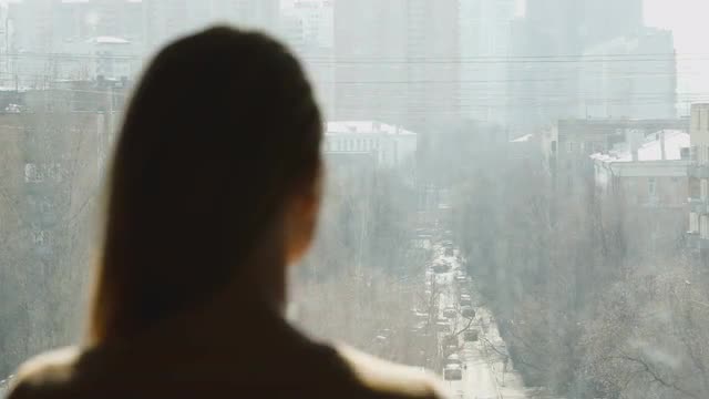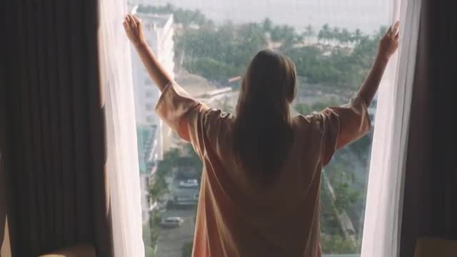 Slow motion shot of business woman opening dark curtains and looking at Hong Kong city crossing hands on the breast