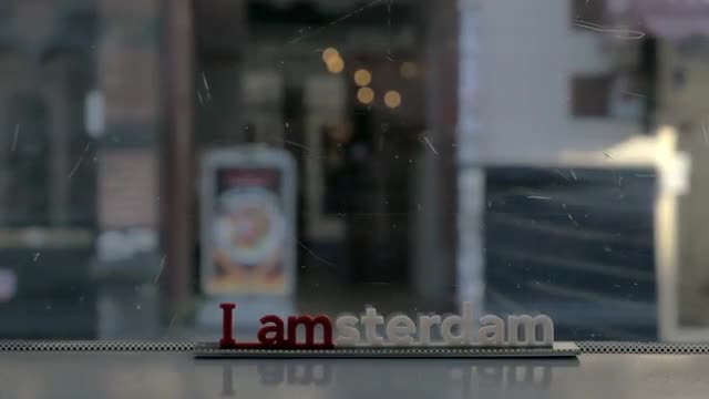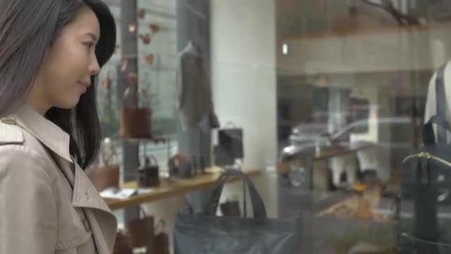 Slow motion clip of woman opening curtains on the view of Hong Kong, China