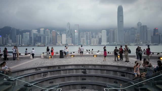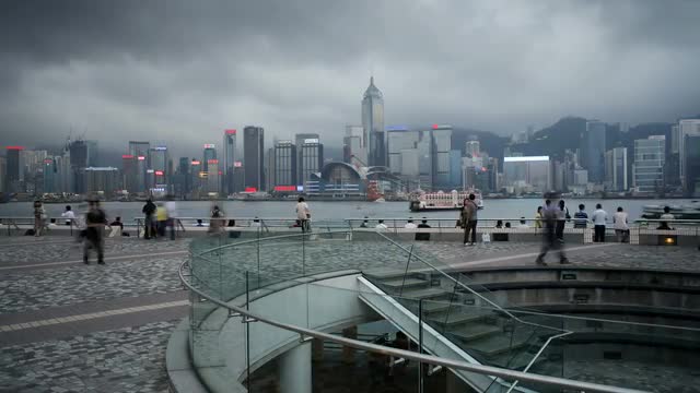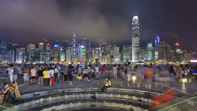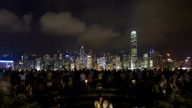 HONG KONG - NOVEMBER 09, 2015: Downtown of Hong Kong during every night light show Symphony of Lights. Illuminated skyscrapers on waterside, ship sailing in quiet harbour