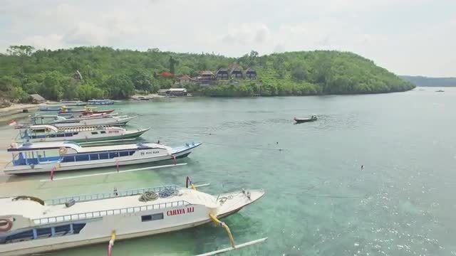 Aerial footage of a beautiful harbour with shallow water and coral reef underneath.