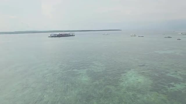 Aerial footage of a beautiful harbour with shallow water and coral reef underneath.