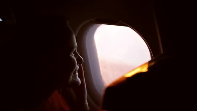 Young woman traveler with roll-on bag walking in the terminal and chatting on mobile phone. View to the airplane and airport area through the window. Shot from moving flat escalator