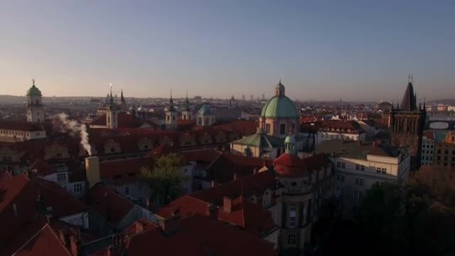 Aerial shot of Prague with its red rooftop architecture, smoke coming out of one of the house chimneys. Czech Republic, Europe