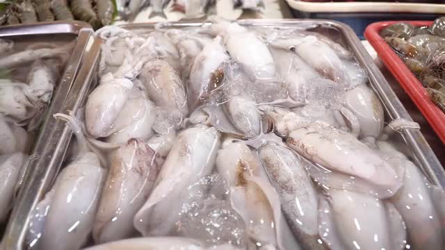 Squids in the water tank of sea food store